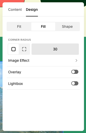 Images have a 30% corner radius (to make the edges rounded). If you’re adding a new image block, edit the corner radius in the “Design” tab (see image right).